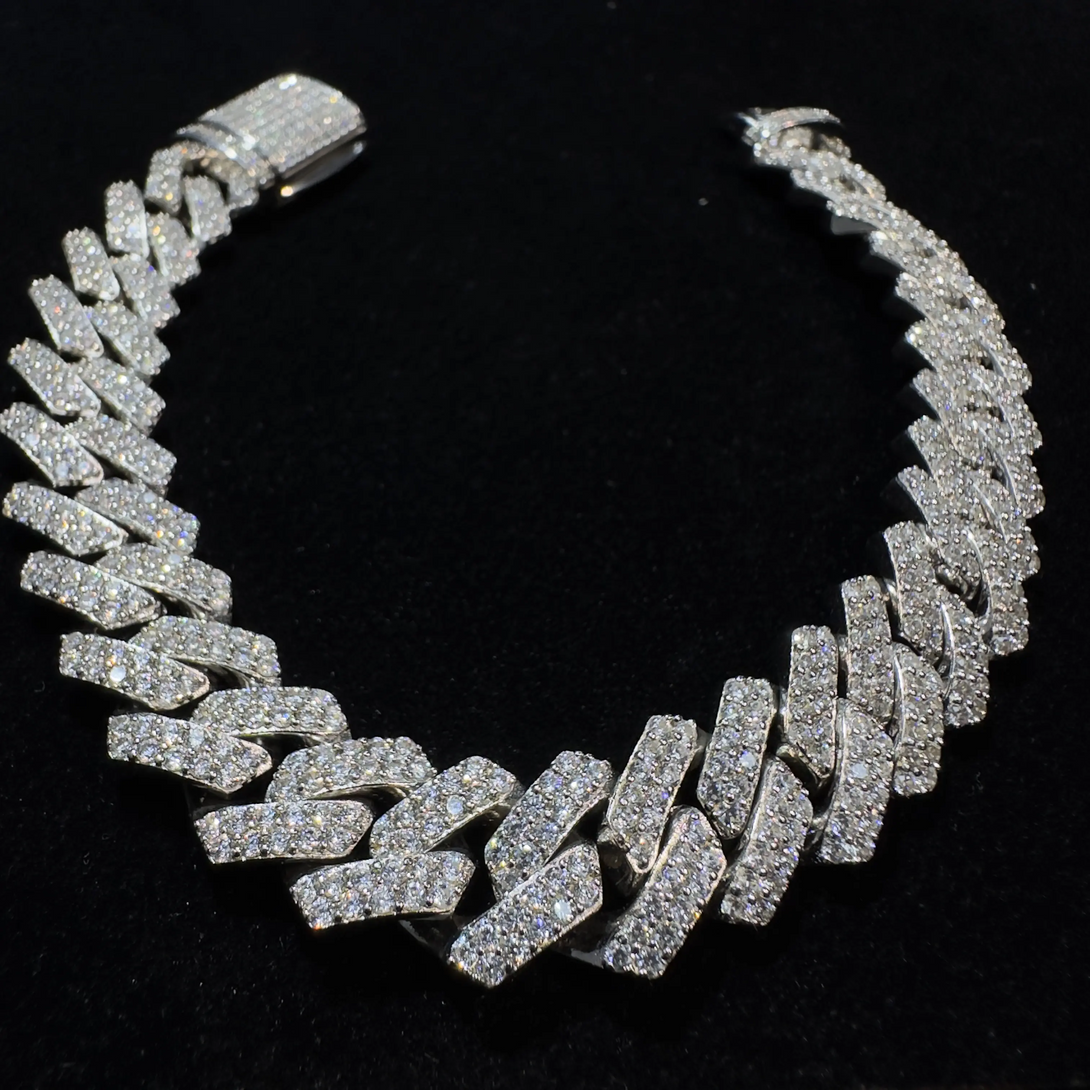 This moissanite cuban link chain is iced out with 2 rows of round cut, colorless (D-Color), VVS moissanite flawless diamonds, placed in a pave and prong diamond setting. All of the diamonds on this moissanite cuban necklace are guaranteed to pass the diamond tester.